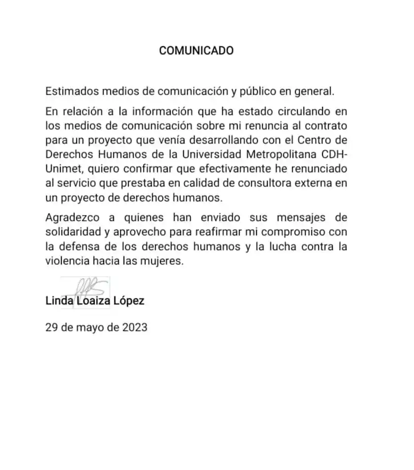 Este lunes, a través de sus redes sociales y mediante sus contactos de WhatsApp, la abogada anunció su renuncia al proyecto sobre DD. HH., en el que participaba, en la Universidad Metropolitana (Unimet).