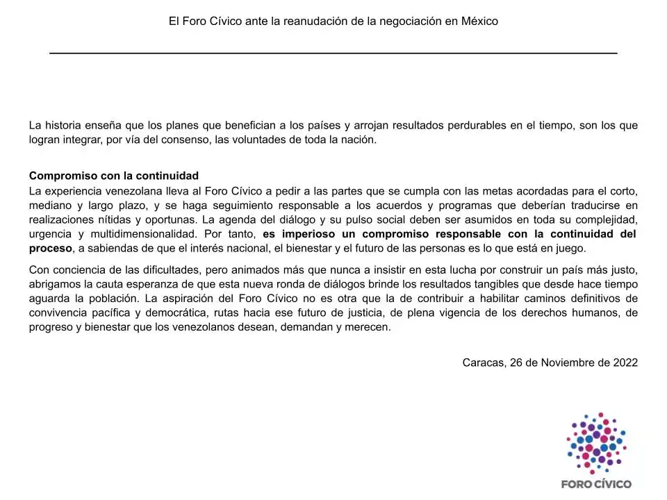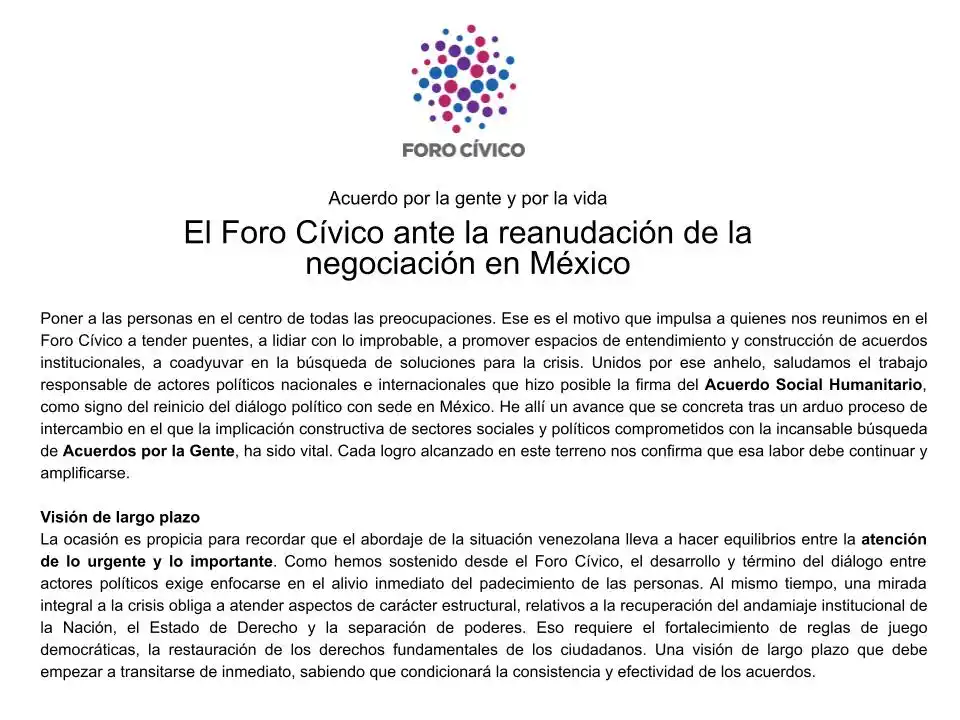 Alrededor de 690 organizaciones y 194 actores de la sociedad civil, agrupadas en el Foro Cívico exhortaron a que el diálogo en México, entre la administración de Nicolás Maduro y la oposición, sea «inclusivo y plural».