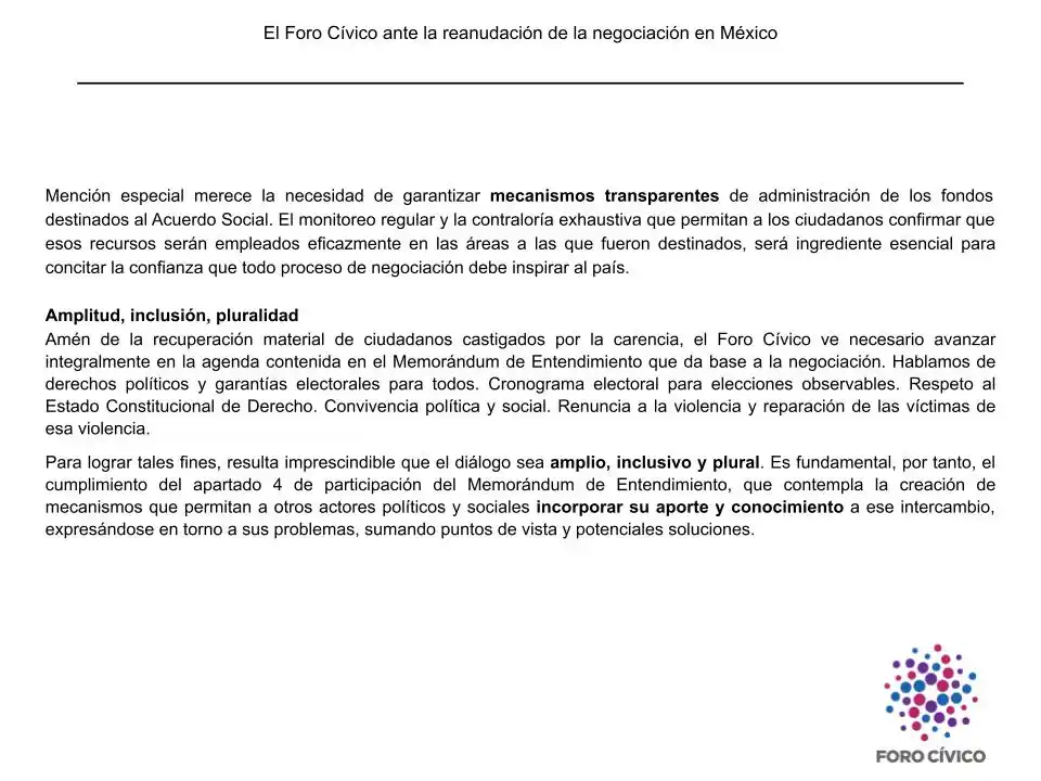 «Es imprescindible que la negociación en México aliente un diálogo amplio, inclusivo, plural, conforme al apartado 4 del Memorando de Entendimiento, que insta a crear mecanismos que permitan a otros actores políticos y sociales incorporar su aporte y conocimiento al intercambio», señala un comunicado del conglomerado difundido por en su cuenta de Twitter.