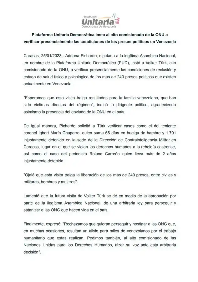 A través de un comunicado, la Plataforma Unitaria pidió al Alto Comisionado de la ONU para los DD.HH., Volker Türk, “verificar presencialmente” las condiciones en que se encuentran los presos políticos.