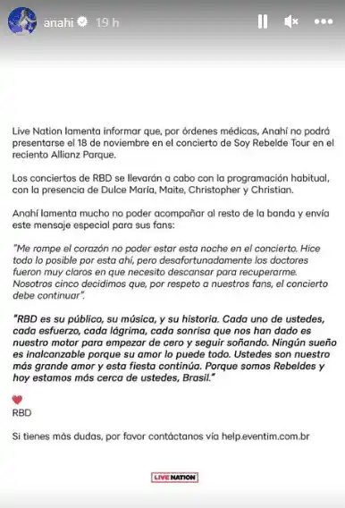 La agrupación mexicana RBD continuará su gira mundial, la cual está prevista concluir en diciembre de este año en México. Anahí se reincorporará a la misma, en la medida en que su salud lo permita.