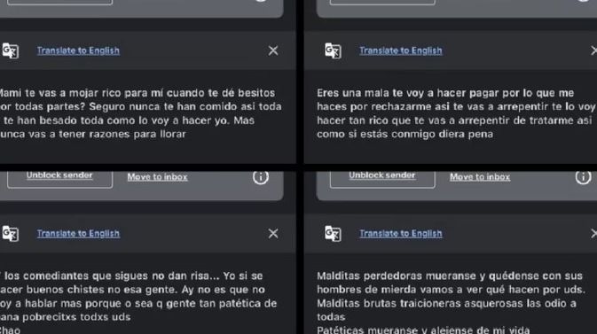 Mandaba motorizados a entregarme cosas. Cientos de mensajes diarios”. El momento más crítico para ella fue cuando “entró a mi edificio y esperó a que yo entrara con mi carro, salió corriendo hacia mi puerta y la intentó forzar, al no poder entrar se montó en el capó de mi carro, saltó en el techo y gritó”. Luego, también, estaban los correos, mensajes que la acosadora, supuestamente, enviaba a todas esas mujeres con mensajes como “mi amor ese culo va para mi casa apenas pueda directo” pero que también, en otros casos, incluían amenazas de muerte.