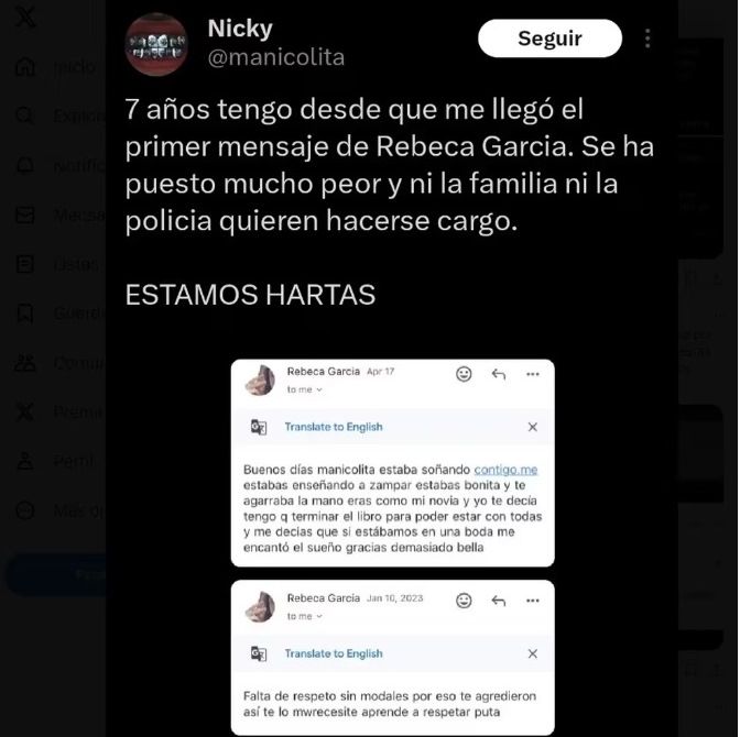 Casos más graves se han dado, reseña Infobae, por ejemplo, en el caso de @cocoaguirre, mujer a la que Rebeca dedicó el libro. “Vino casi diariamente a mi edificio, llenó de grafitis toda mi calle con mi nombre, mi apellido, mi usuario.