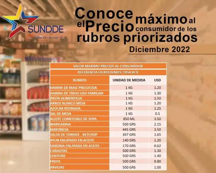 La Sundde anunció este jueves la regulación de precios al consumidor de 42 alimentos, con vigencia para todo el mes de diciembre.