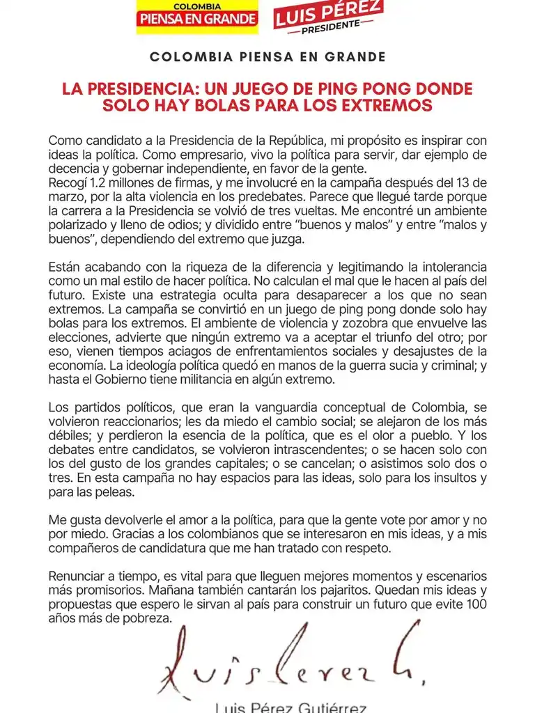 A menos de 20 días de que se celebre la primera vuelta presidencial, el candidato Luis Pérez anunció, muy temprano en la mañana de este miércoles 11 de mayo, que desiste de competir por llegar a la Casa de Nariño.