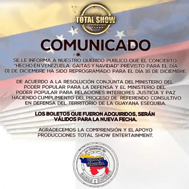 Según un comunicado de la empresa Total Show, la decisión obedeció «a la resolución conjunta del ministerio de la Defensa y el ministerio de Relaciones Interiores, Justicia y Paz haciendo cumplimiento del proceso de referendo consultivo en defensa del territorio de la Guayana Esequiba», según informaron en un comunicado.