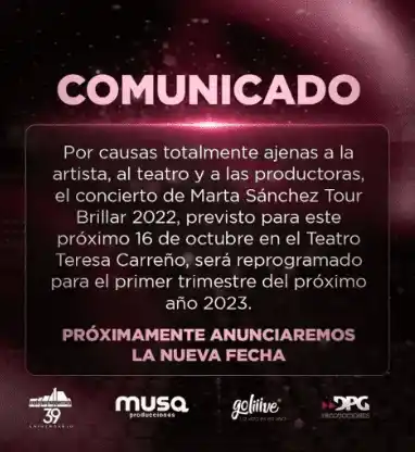 «Queremos comunicar al público en general y medios de comunicación, que por causas totalmente ajenas a la artista, al teatro y a las productoras, el concierto de Marta Sánchez Tour Brillar 2022, previsto para este próximo 16 de octubre en el Teatro Teresa Carreño, será reprogramado para el primer trimestre del próximo año 2023».
