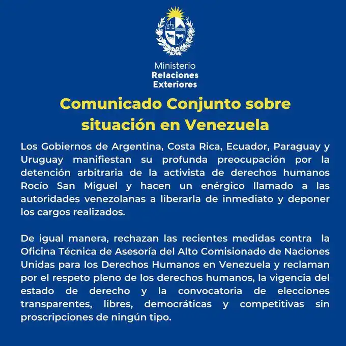 En el escrito, difundido mediante la cuenta en X del gobierno de Uruguay, estas naciones expresa su «profunda preocupación por la detención arbitraria de la activista de derechos humanos Rocío San Miguel”.