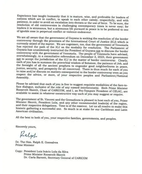 «Ambos habéis acordado conmigo que dicha reunión se celebrará bajo los auspicios de CELAC, de la que San Vicente y las Granadinas es presidente pro tempore, y CARICOM, cuyo presidente actual es la Commonwealth de Dominica. Ambos habéis solicitado también la distinguida presencia del estimado Presidente de la República Federativa del Brasil, Su Excelencia Luiz Inácio Lula da Silva. En consecuencia, se envía una invitación a nuestro querido hermano Lula», se expone.