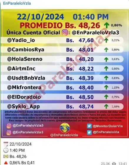La divisa norteamericana sigue dando dolores de cabeza a los venezolanos, afectado a la economía de manera dramática. La tarde de este martes 22 de octubre nos llega noticia del nuevo registro del dólar no oficial, según los marcadores del mismo en las redes sociales, que llega a niveles inusitados: 48,26 bolívares por unidad de divisa estadounidense.