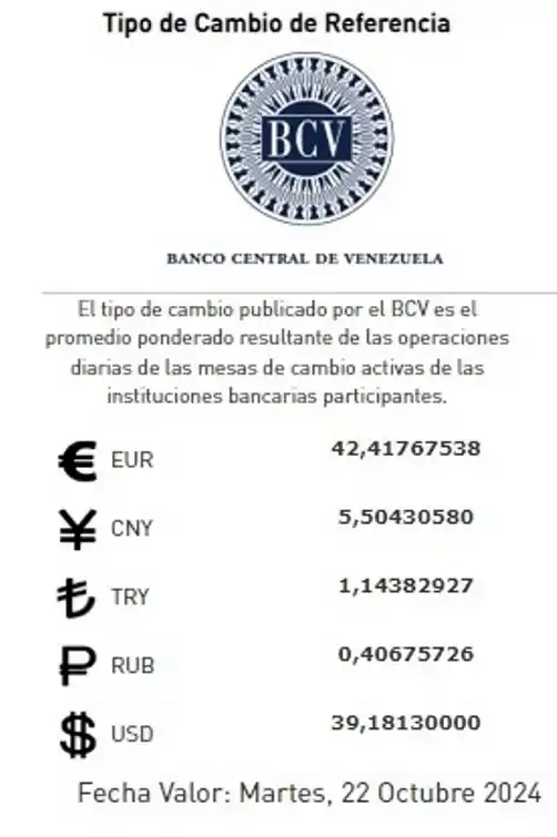 El registro de dólar que publica el BCV, que es el promedio ponderado resultante de las operaciones diarias de las mesas de cambio activas de las instituciones bancarias participantes, para esta misma fecha es de 39,18 Bs/$.