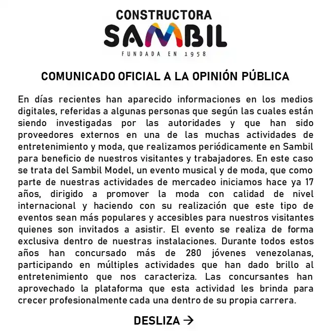 Esto tras la captura de la directora de Sambil Moldel. «Proveedores externos en una de las muchas actividades de entretenimiento y moda, que realizamos periódicamente en Sambil…», manifiesta.