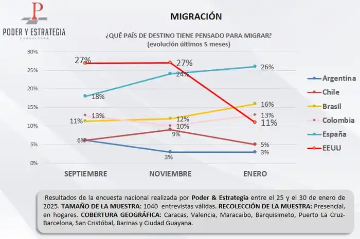 Colombia se mantuvo estable con un 13% de preferencia de los potenciales migrantes, mientras que Chile también perdió preferencia como destino al pasar de 6% a 9% entre septiembre y noviembre para luego caer a 5% en enero pasado.