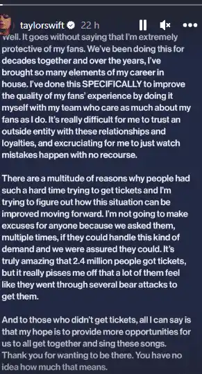 Taylor Swift criticó el comportamiento de la tickera y que impidió a sus fanáticos comprar un boleto