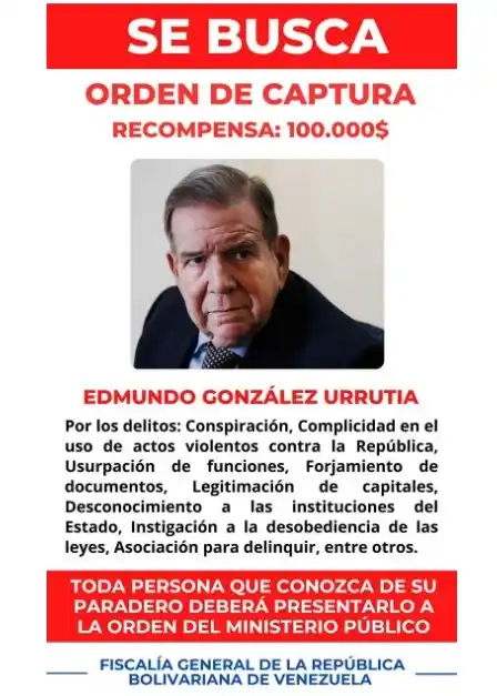 El Gobierno de Venezuela, a través de prensa del Cuerpo de Investigaciones Científicas, Penales y Criminalísticas, ha anunciado una recompensa de 100.000 dólares estadounidenses por la captura del opositor Edmundo González.