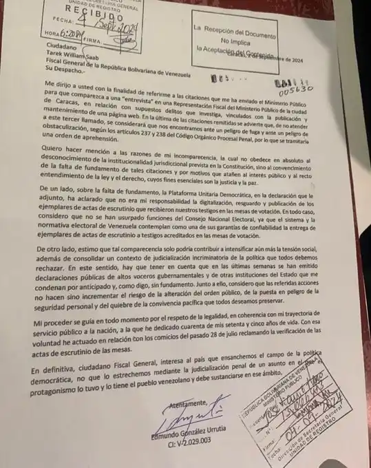 Este miércoles se filtró por redes sociales, el contenido de la carta que el dirigente opositor Edmundo González Urrutia, envió al fiscal general, Tarek William Saab, con su abogado José Vicente Haro.