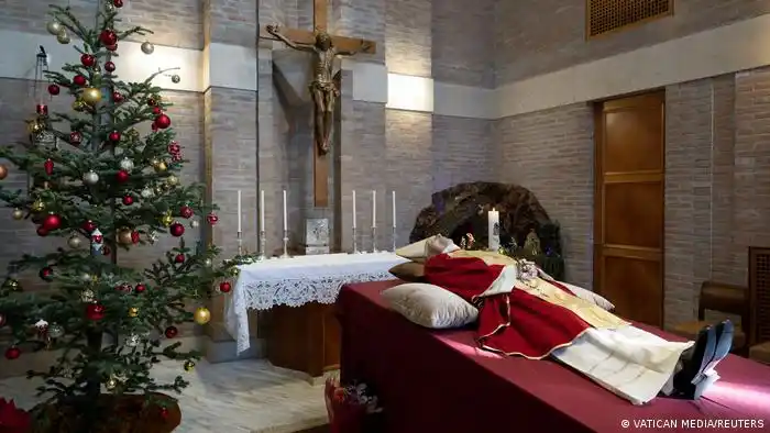 Las primeras imágenes de Benedicto XVI difundidas este domingo por la Santa Sede le muestran yacente en una sala del monasterio, acostado sobre dos cojines, bajo un gran crucifijo y junto a un cirio encendido, un árbol de Navidad y un Portal de Belén. Viste los paramentos pontificales: la sotana blanca y la casulla roja, en sus manos tiene un rosario y sobre su cabeza la mitra.