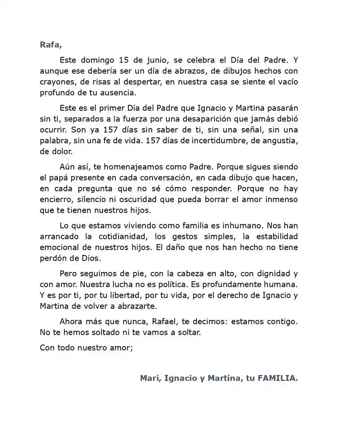 «Rafa, escribí una carta que me nace publicarla por esta vía porque, a pesar de que no sé dónde te tienen realmente y se me niegue todo tipo de comunicación contigo, tengo la esperanza que alguien con algo de humanidad te la relate», dice la misiva publicada en la su cuenta en X.