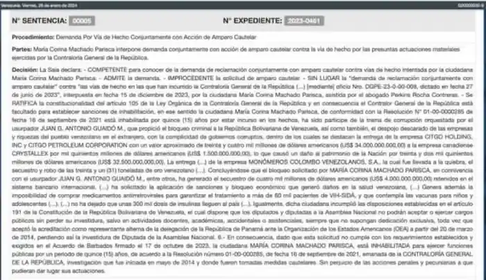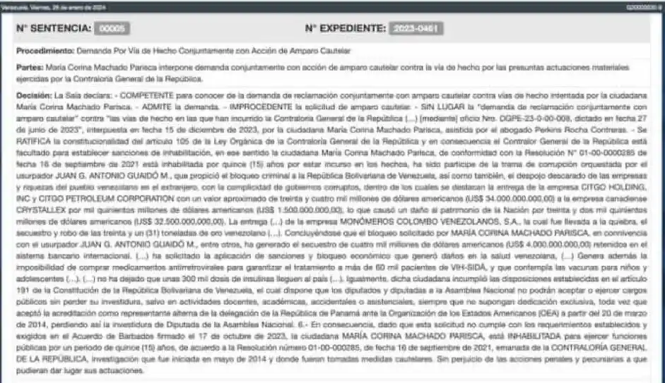 «Se RATIFICA la constitucionalidad del artículo 105 de la Ley Orgánica de la Contraloría General de la República y en consecuencia el Contralor General de la República está facultado para establecer sanciones de inhabilitación, en ese sentido la ciudadana María Corina Machado Parisca, de conformidad con la Resolución N° 01-00-0000285 de fecha 16 de septiembre de 2021 está inhabilitada por quince (15) años por estar incurso en los hechos, ha sido participe de la trama de corrupción orquestada por el usurpador JUAN G. ANTONIO GUAIDÓ M., que propició el bloqueo criminal a la República Bolivariana de Venezuela, así como también, el despojo descarado de las empresas y riquezas del pueblo venezolano en el extranjero, con la complicidad de gobiernos corruptos, dentro de los cuales se destacan la entrega de la empresa CITGO HOLDING, INC y CITGO PETROLEUM CORPORATION con un valor aproximado de treinta y cuatro mil millones de dólares americanos (US$ 34.000.000.000,00) a la empresa canadiense CRYSTALLEX por mil quinientos millones de dólares americanos (US$ 1.500.000.000,00), lo que causó un daño al patrimonio de la Nación por treinta y dos mil quinientos millones de dólares americanos (US$ 32.500.000,000,00). La entrega (…) de la empresa MONÓMEROS COLOMBO VENEZOLANOS, S.A., la cual fue llevada a la quiebra, el secuestro y robo de las treinta y un (31) toneladas de oro venezolano (…)».
