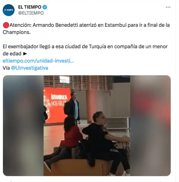 Llama la atención que si Benedetti fue a Estambul para presenciar la final de la Champions League 2023, en el Estadio Olímpico Atatürk de Estambul… se pune que estaría en la zona NACIONAL en la parte de arribos del aeropuerto de Estambul; sin embargo Benedetti fue fotografiado sentado en una de las salas de esperas del área internacional.