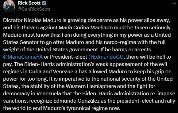 El senador estadounidense, Rick Scott, le advirtió a Nicolás Maduro que si arrestan a María Corina Machado (@MariaCorinaYA) y Edmundo González (@EdmundoGU) "habrá mucho que pagar"