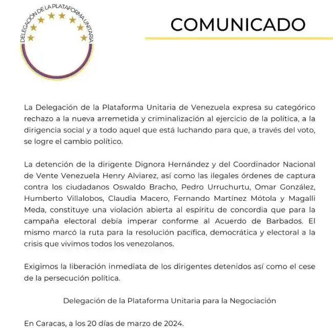 Mientras que la colisión de la Plataforma Unitaria emitió un comunicado donde expresó su categórico rechazo a la «arremetida y criminalización al ejercicio de la política, a la dirigencia social y a todo aquel que está luchando para que, a través del voto, se logre el cambio político».