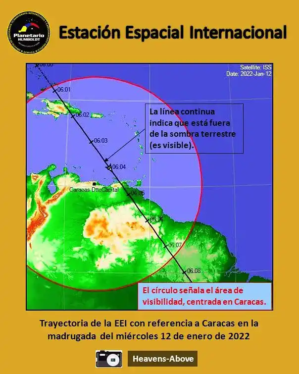 La información fue suministrada por el Planetario Humboldt, observatorio astronómico venezolano, que a través de las redes sociales informa que el avistamiento podrá durar unos 6 minutos 33 segundos. Posteriormente, la Estación Espacial Internacional completará su vuelta en horas de la noche.