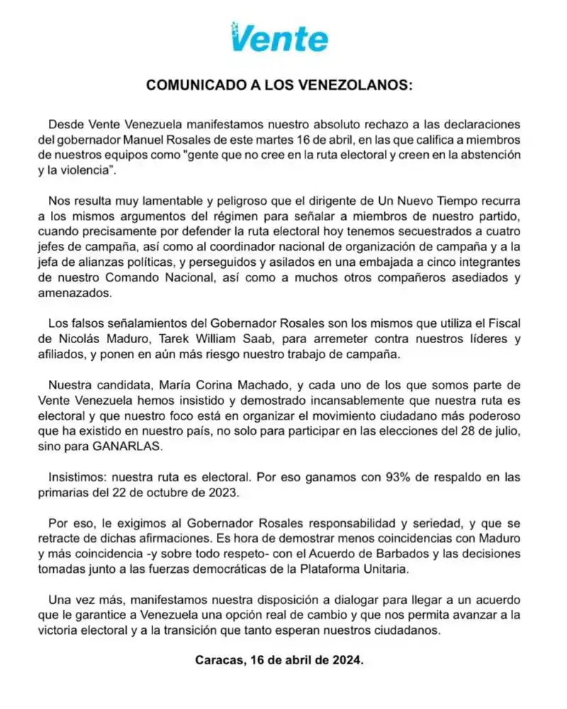 Al punto de que en un comunicado, la organización fundada por María Corina Machado, calificó las palabras de Rosales como «lamentables», en un momento en que ambos dirigentes están en el ojo del huracán, porque de sus acuerdos depende que la oposición agrupada en la Plataforma Unitaria tenga un candidato de común acuerdo para las elecciones del 28 de julio.