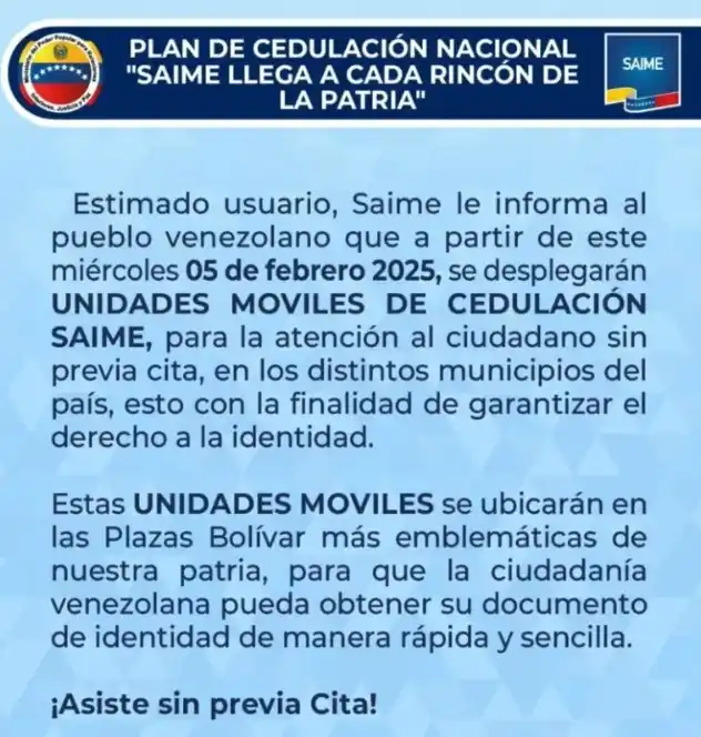 El Servicio Administrativo de Identificación, Migración y Extranjería (Saime) anunció que a partir del miércoles 5 de febrero se despliegan unidades móviles de cedulación en distintos municipios de Venezuela para garantizar el derecho a la identidad.