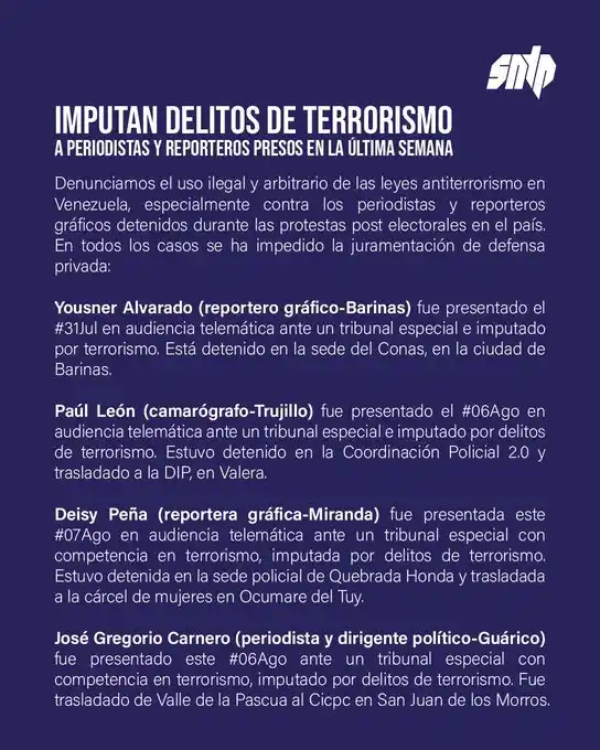 El Sindicato Nacional de Trabajadores de la Prensa (SNTP) denunció que hay cuatro periodistas imputados por el delito de “terrorismo”, tras ser detenidos durante las protestas contra el resultado oficial de las elecciones presidenciales del pasado 28 de julio.