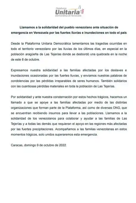 La Plataforma Unitaria hizo un llamado a los venezolanos para que manifiesten su solidaridad con los afectados por las lluvias caídas en las últimas horas y que han ocasionado la tragedia de Las Tejerías, estado Aragua, así como destrozos, inundaciones y pérdidas materiales cuantiosas en otras entidades.