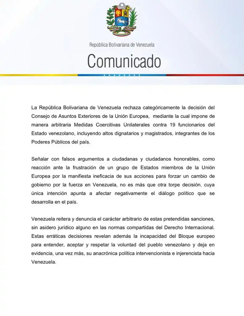 Para la administración de Nicolás Maduro las nuevas sanciones de la Unión Europea, esta vez para 19 de sus funcionarios, son inaceptables. En un comunicado, difundido por Jorge Arreaza, las personas afectadas son «ciudadanos honorables».