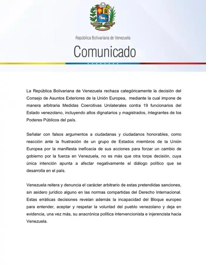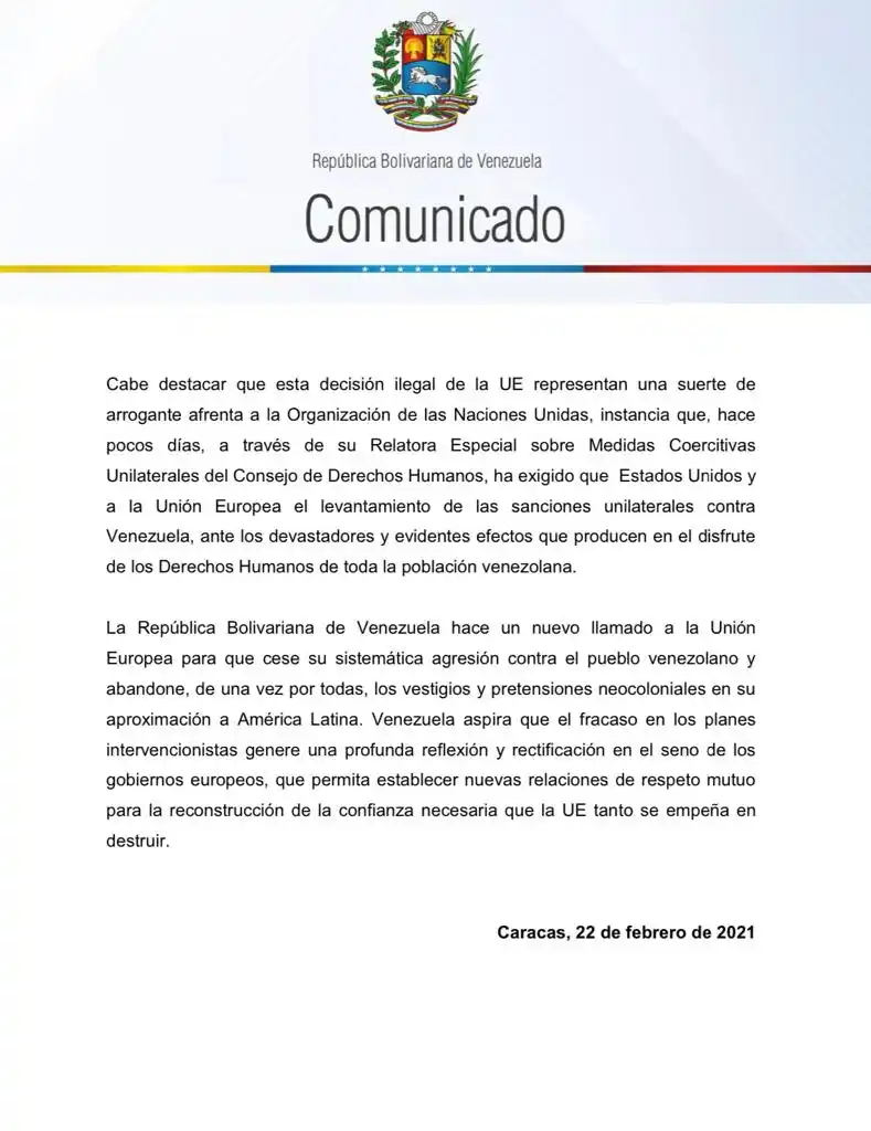 A través de un comunicado, la administración de Nicolás Maduro asegura que las nuevas sanciones de la Unión Europea son una afrenta a la ONU