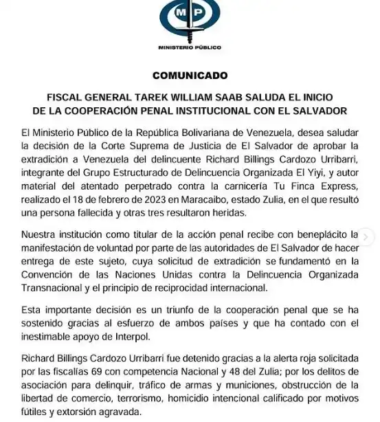 «El Ministerio Público de la República Bolivariana de Venezuela desea saludar la decisión de la Corte Suprema de Justicia de El Salvador de aprobar la extradición a Venezuela del delincuente Richard Billings Cardozo Urribarri, integrante del Grupo Estructurado de Delincuencia Organizada El Yiyi y autor material del atentado perpetrado contra la carnicería Tu Finca Express, el 18 de febrero de 2023, en Maracaibo, estado Zulia, en el que resultó una persona fallecida y otras tres resultaron heridas», reza el texto.