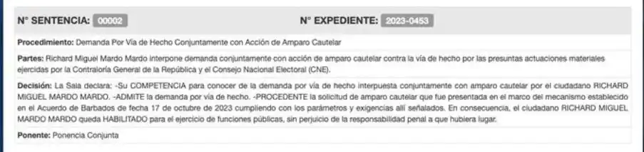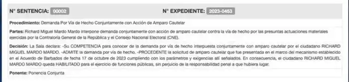«ADMITE la demanda por vía de hecho. -PROCEDENTE la solicitud de amparo cautelar que fue presentada en el marco del mecanismo establecido en el Acuerdo de Barbados de fecha 17 de octubre de 2023 cumpliendo con los parámetros y exigencias allí señalados. En consecuencia, el ciudadano RICHARD MIGUEL MARDO MARDO queda HABILITADO para el ejercicio de funciones públicas, sin perjuicio de la responsabilidad penal a que hubiera lugar».