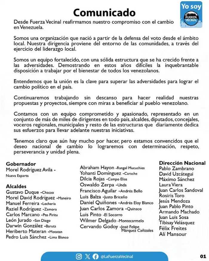 El escrito se difunde a dos días de la renuncia de 59 dirigentes de Fuerza Vecinal, entre ellos varios alcaldes y concejales, además de dirigentes de base, entre ellos los burgomaestres de El Hatillo y Los Salias, Elías Sayegh y Josy Fernández, respectivamente.