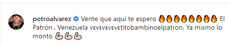 El reguetonero, con sus más de 4 millones de seguidores, recibió respuestas inmediatas a su solicitud. Entre ellas, la del presidente del Hipódromo La Rinconada y también cantante, Antonio «El Potro» Álvarez. El exbeisbolista le dijo que iba a preparar su recibimiento. «Vente que aquí te espero. El Patrón. Venezuela bambinoelpatron. Ya mismo lo monto», aseguró.