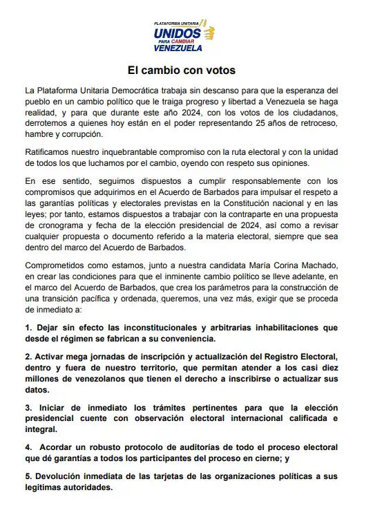 La Plataforma Unitaria emitió un comunicado para ratificar su compromiso con la ruta electoral y con la candidata @MariaCorinaYA.