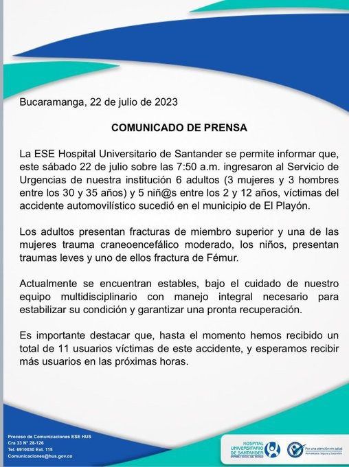 Posteriormente a que se hiciera público el terrible accidente ocurrido en El Playón, el hospital de Santander, informó que pasadas las 7:50 de la mañana de este sábado ingresaron a urgencias seis adultos (tres hombres y tres mujeres) y cinco niños en edades comprendidas entre dos y doce años.