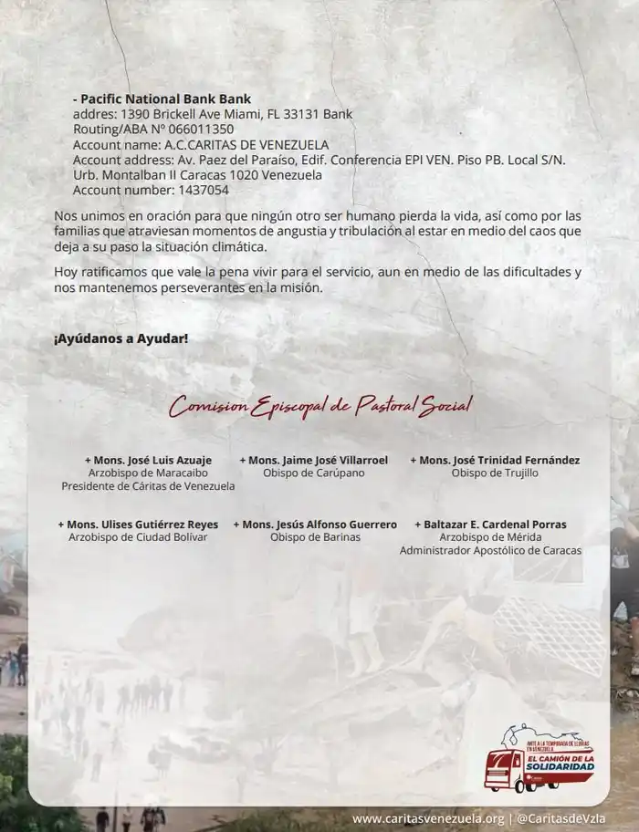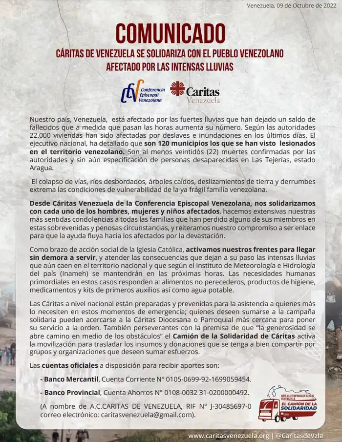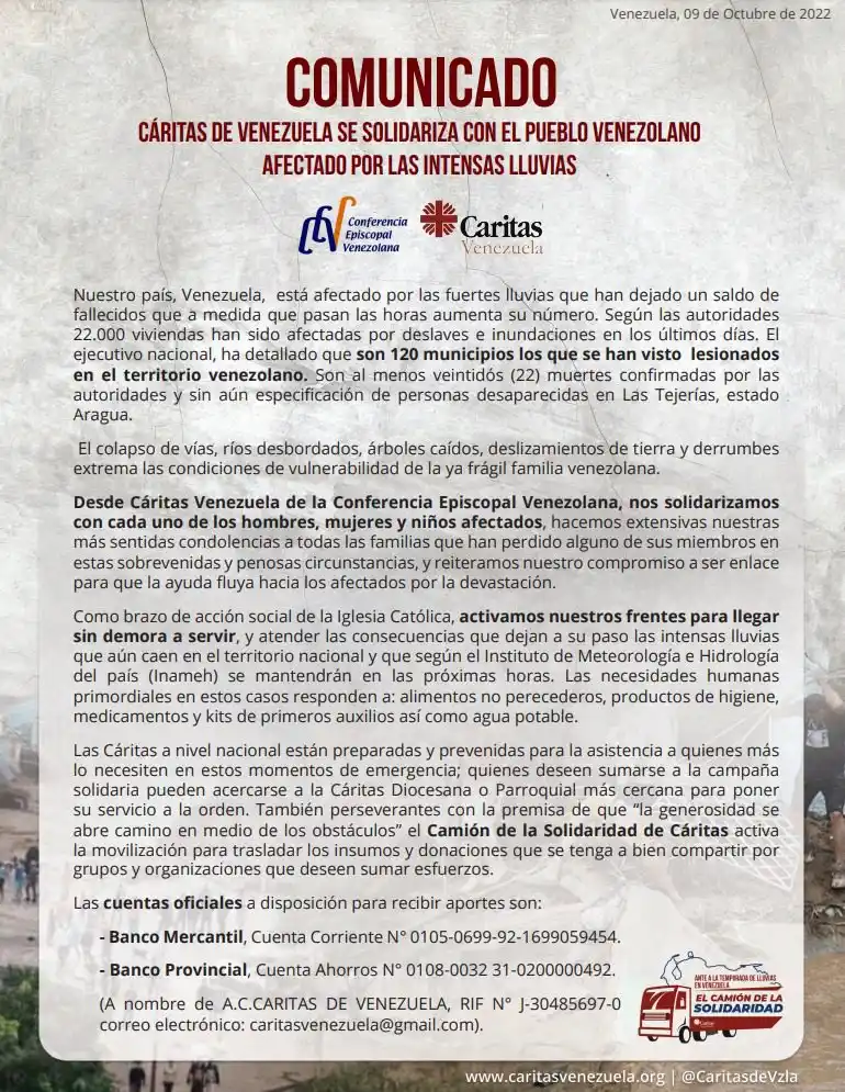 La ONG Cáritas de Venezuela informó, mediante un comunicado, que habilitaron cuentas bancarias para recibir donativos de dinero que será destinado a la atención de las familias damnificadas por el deslave en Tejerías, estado Aragua.