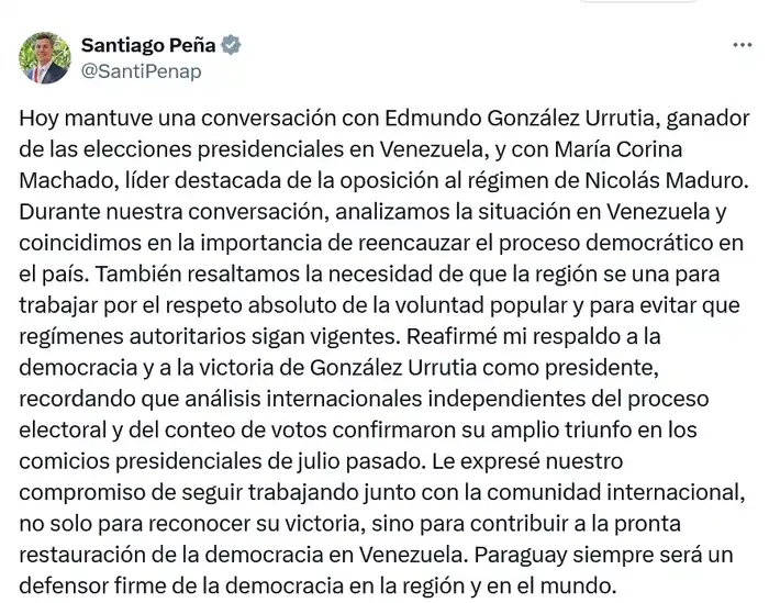 «Reafirmé mi respaldo a la democracia y a la victoria de González Urrutia … Le expresé nuestro compromiso de seguir trabajando junto con la comunidad internacional, no solo para reconocer su victoria, sino para contribuir a la pronta restauración de la democracia en Venezuela. Paraguay siempre será un defensor firme de la democracia en la región y en el mundo», agregó.