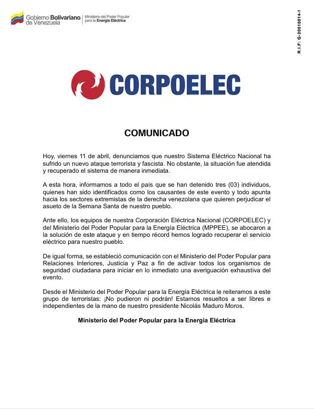 El Gobierno venezolano denunció este viernes 11 de abril un nuevo ataque terrorista contra el Sistema Eléctrico Nacional (SEN), el cual atribuyó a sectores extremistas de la derecha que tiene como objetivo interrumpir el asueto de Semana Santa.