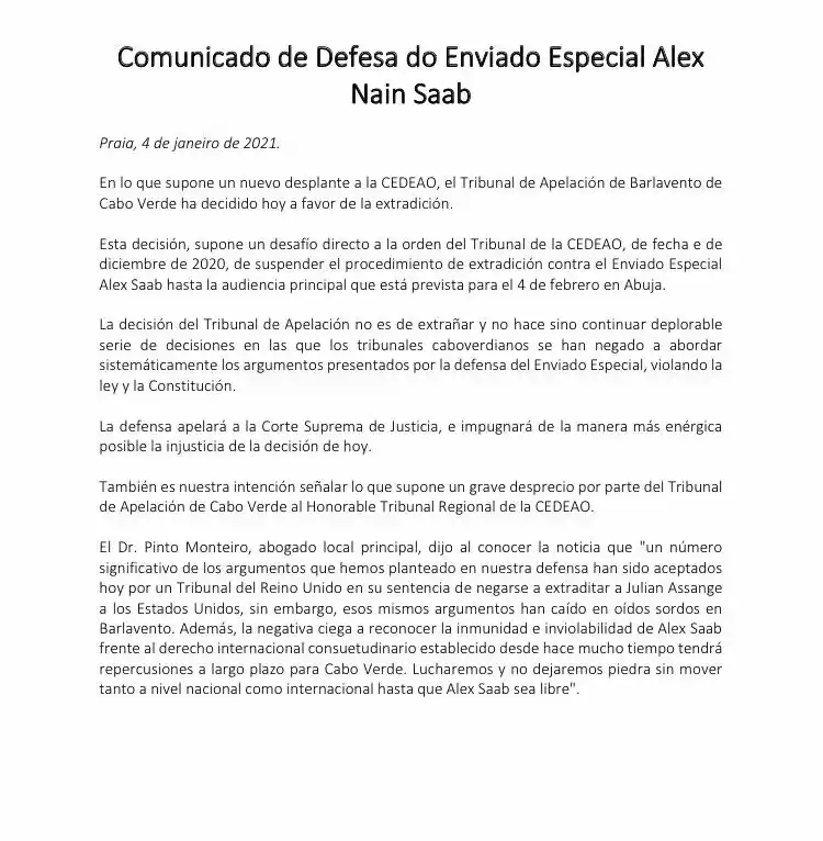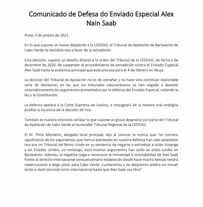 Mediante un comunicado, la defensa de Saab aseguró que el tribunal de Apelación de Cabo Verde desafía la orden del tribunal Comunidad Económica de Estados de África Occidental (Cedeao) sobre conceder arresto domiciliario a Alex Saab.