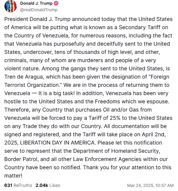 «Venezuela ha sido muy hostil hacia Estados Unidos y las libertades que defendemos. Por lo tanto, cualquier país que compre petróleo o gas de Venezuela estará obligado a pagar un arancel del 25% a Estados Unidos sobre cualquier comercio que realice con nuestro país. Toda la documentación se firmará y registrará, y el arancel entrará en vigor el 2 de abril de 2025, Día de la Liberación de América», esgrimió.