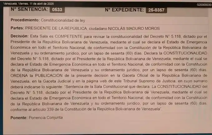 «La Sala Constitucional revisó la solicitud enviada por el Ejecutivo Nacional y, mediante su decisión Nro. 533, se pronunció, declarando la constitucionalidad del Decreto Nro. 5.118 dictado por el Presidente de la República Bolivariana de Venezuela, Nicolás Maduro Moros, a través del cual declaró el Estado de Emergencia Económica en todo el territorio nacional por un lapso de sesenta días (60), conforme al artículo 339 de la Constitución de la República Bolivariana de Venezuela», señala el texto.