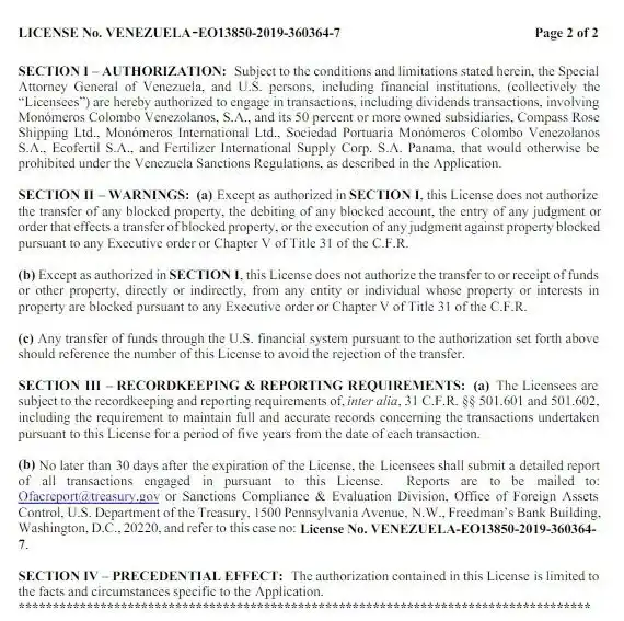 «Sujeto a las condiciones y limitaciones establecidas en la presente, el Fiscal General Especial de Venezuela y las personas de los EE.UU., incluidas las instituciones financieras están autorizados a realizar transacciones, incluidas las transacciones de dividendos, que involucran a Monómeros Colombo Venezolanos, S.A., y sus subsidiarias donde se tiene propiedad del 50 por ciento o más, Compass Rose Shipping Ltd., Monómeros International Ltd., Sociedad Portuaria Monómeros Colombo Venezolanos S.A., Ecofertil S.A., y Fertilizer International Supply Corp. S.A. Panamá, que de otro modo estaría prohibido bajo las Regulaciones de Sanciones de Venezuela, como se describe en la Solicitud», dice un documento conocido por el diario.