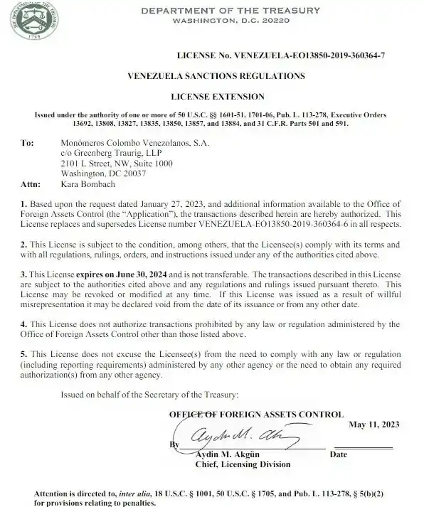 Estados Unidos renovó, por un año más, la licencia que le permite a la empresa colombo-venezolana Monómeros operar sin las sanciones decretadas anteriormente por la Oficina para el Control de Activos del Departamento del Tesoro (OFAC).