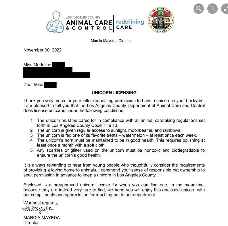 «Querido condado de Los Ángeles. Quisiera su aprobación para tener un unicornio en mi patio trasero, si puedo encontrar uno. Por favor, envíenme una respuesta. Madeline».