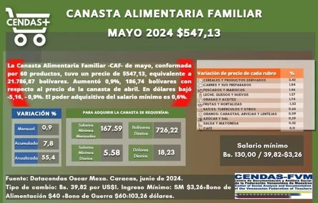 La Canasta Alimentaria Familiar del mes de mayo se ubicó en 547,13 dólares, equivalente a Bs. 21.786, según Óscar Meza, director del Centro de Documentación y Análisis Social de la Federación Venezolana de Maestros (Cendas-FVM).