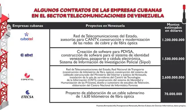 “Cubatel, Copextel, Albet y Etecsa son empresas cubanas que han hecho fortuna. Todo gracias a contratos con empresas del Estado e instituciones públicas de Venezuela. Esto le ha permitido a la dictadura de Maduro copiar el sistema cubano de control político y financiar a La Habana”, aseveró, en nota de prensa.